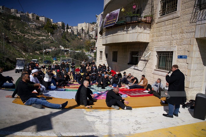 القدس – فينيق نيوز – أدى مواطنون صلاة الجمعة أمام بناية مهددة بالهدم من قبل سلطات الاحتلال الإسرائيلي، في حي واد قدوم ببلدة سلوان، جنوب المسجد الأقصى المبارك.