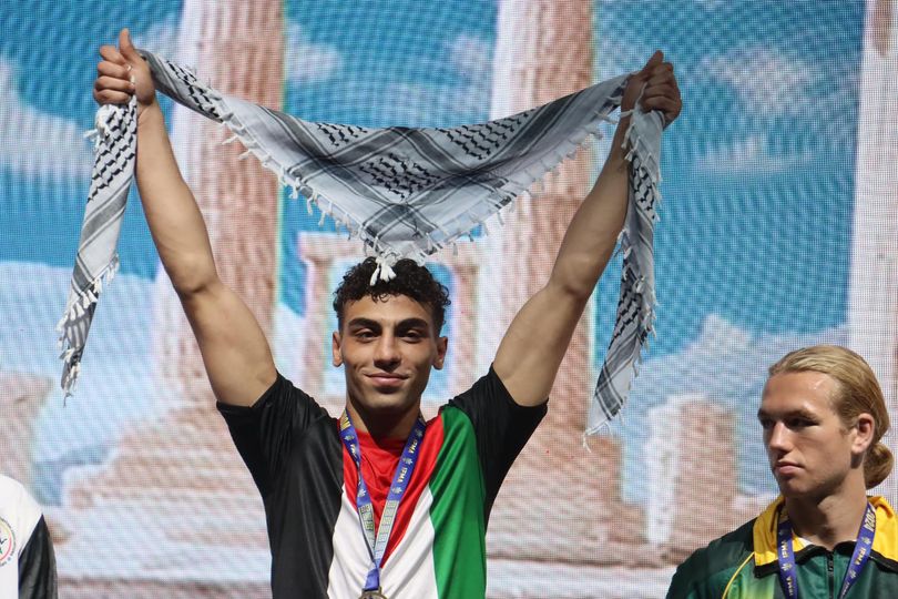 واعتلى العملة منصة التتويج حاملاً الكوفية كرمز وطني ورسالة سامية بات يجسدها الرياضيون الفلسطينيون في تسليط الضوء على فلسطين وقضيتها العادلة، من خلال منصات التتويج.