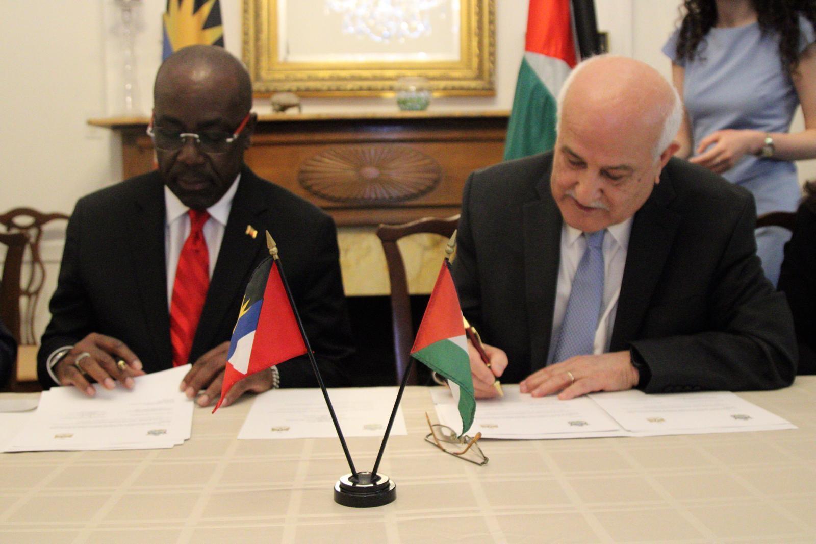 وقعت دولة فلسطين وأنتيغوا وباربودا اليوم الجمعة، اتفاقية لإقامة علاقات دبلوماسية بين البلدين.