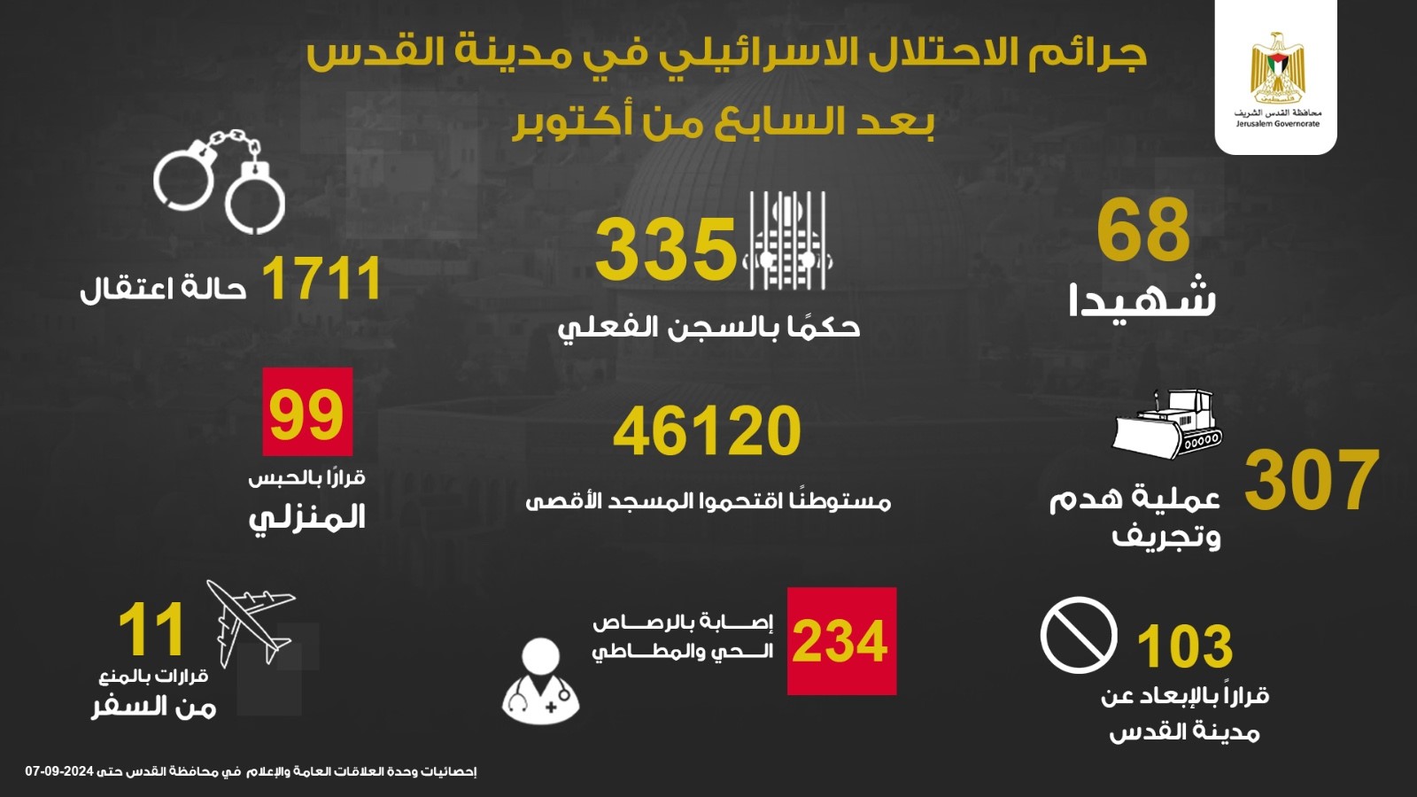 وفي غضون ذلك، قالت وحدة العلاقات العامة والإعلام في محافظة القدس، إن 68 مواطنا استشهدوا، واعتقل 1711 منذ السابع من تشرين الأول/ أكتوبر من العام الماضي.