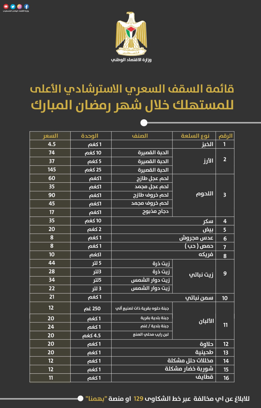 رام الله – فينيبق نيوز – أعلنت وزارة الاقتصاد الوطني، اليوم الإثنين، قائمة السقف السعري الاسترشادي الأعلى للمستهلك، والتي تضم 15 سلعة خلال شهر رمضان المبارك، على أن تخضع للمراجعة أسبوعياً.
