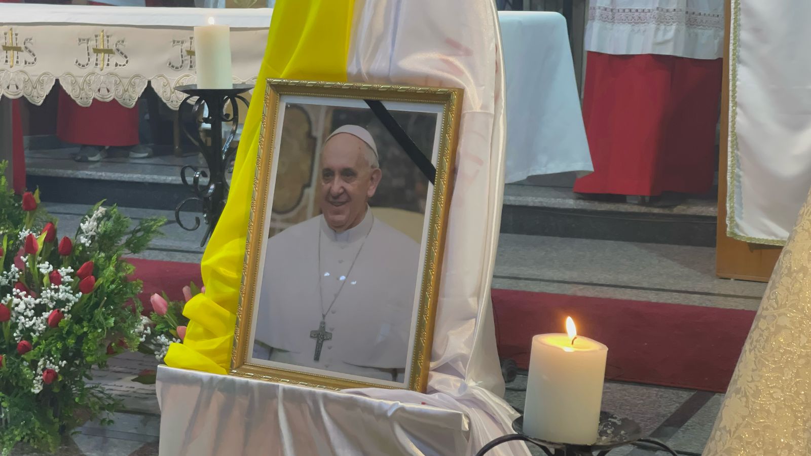 ووضعت صورة البابا الراحل في وسط الكنيسة، إلى جانب علمي فلسطين والفاتيكان، وسط أجواء من الحزن على رحيل البابا الذي كان على تواصل دائم مع راعي الكنيسة ومساعده ومع النازحين في الكنيسة منذ بدء العدوان، وحتى عندما ألمت به الوعكة الصحية الأخيرة، حيث كان آخر اتصال له قبل يومين للاطمئنان على أحوال الفلسطينيين، المسيحيين والمسلمين، في غزة، خاصة خلال الأسبوع المقدس وعيد القيامة.