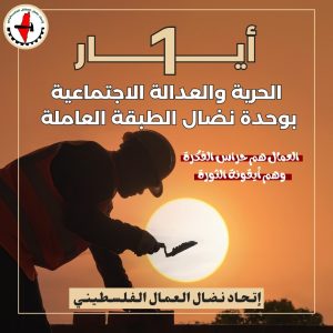 نتوجه بالتحية لشهداء شعبنا، وشهداء الطبقة العاملة، والى أسرى الحرية في سجون الاحتلال، ونتوجه بالتحية إلى حركة المقاطعة BDS لدورها في فضح سياسات الاحتلال وممارساته، وندعو إلى أهمية توسيع نشاطها ومحاصرة الاحتلال ومعاقبته على جرائمه الوحشية بحق شعبنا، ونحيي نضالات الطبقة العاملة العالمية والعربية التي تقف بشجاعة في دعم القضية الفلسطينية والتي تقف أيضاً بوجه العنصرية العدوانية الفاشية وفي وجه السياسات والإجراءات الإمبريالية الأمريكية وأدواتها في المنطقة، وندعو كافة حركات التحرر في العالم وقوى اليسار والتقدم والحركة النقابية والعمالية إلى تعزيز مقاطعة إسرائيل وسحب الاستثمارات منها وفرض العقوبات عليها، وتعزيز النضال الأممي ضد سياسات إدارة ترامب الداعمة للاحتلال، وإعلاء راية نضال الطبقة العاملة في العالم في مناهضة الامبريالية المتوحشة وإفرازاتها المعادية لعمال وشعوب العالم.