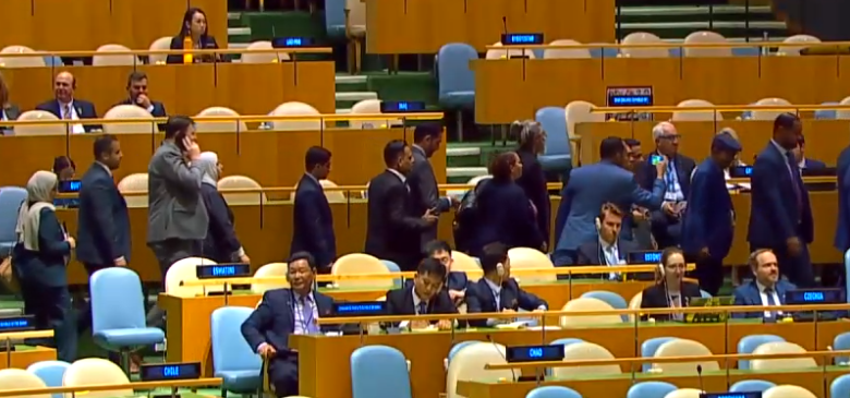 انسحبت الوفود الرسمية، من مقر الجمعية العامة للأمم المتحدة، فور صعود رئيس وزراء الاحتلال الإسرائيلي، على المنصة للإلقاء كلمته.