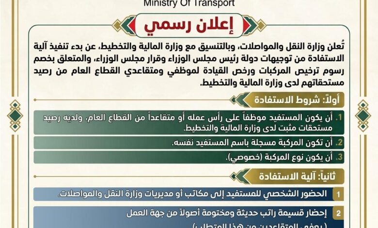 وأوضحت الوزارة أنه يجب أن يكون المستفيد من هذا القرار موظفاً على رأس عمله أو متقاعداً من القطاع العام، ولديه رصيد مستحقات مثبت لدى وزارة المالية والتخطيط، كما يجب أن تكون المركبة مسجلة باسم المستفيد نفسه، وكذلك أن يكون نوع المركبة (خصوصيا).